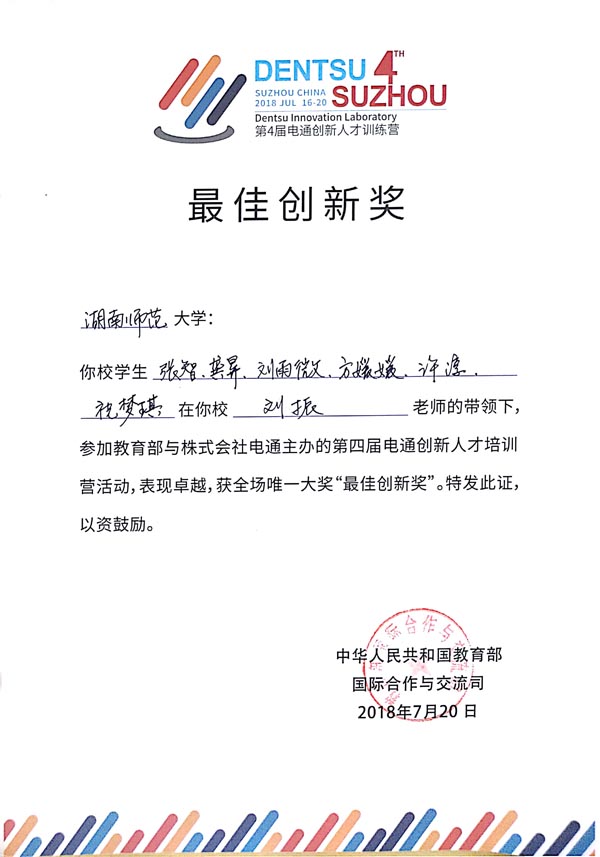 此次训练营,我校首次受邀组队参加。在指导老师刘振的带领下,由16级广告专业张智、龚昪、刘雨微、方媛媛、许淳和祝梦琪同学组成的湖南师范大学代表队,经由电通专家严格公正的评审,在最终的创意项目提案的环节凭借“Easy Eating”创意项目力压强敌,斩获全场唯一大奖——“最佳创新奖”。