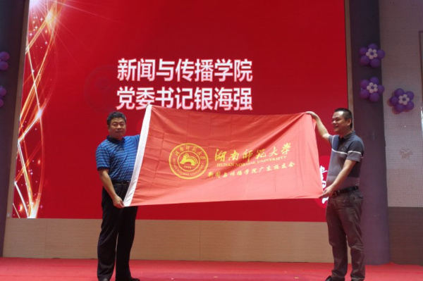 我院党委书记银海强为我院广东校友会授旗。我校校友总会秘书长杨玲、我院副院长闵素芬为理事会成员颁发聘书。