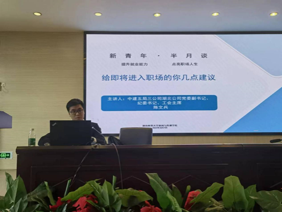 (通讯员 黄国钊)为进一步增强我院学生的生涯规划与职业发展意识,提升自我认知水平与职业探索能力,4月7日下午,中建五局三公司湖北公司党委副书记、纪委书记、工会主席陈文兵于我院书山论坛讲授高校就业指导课。