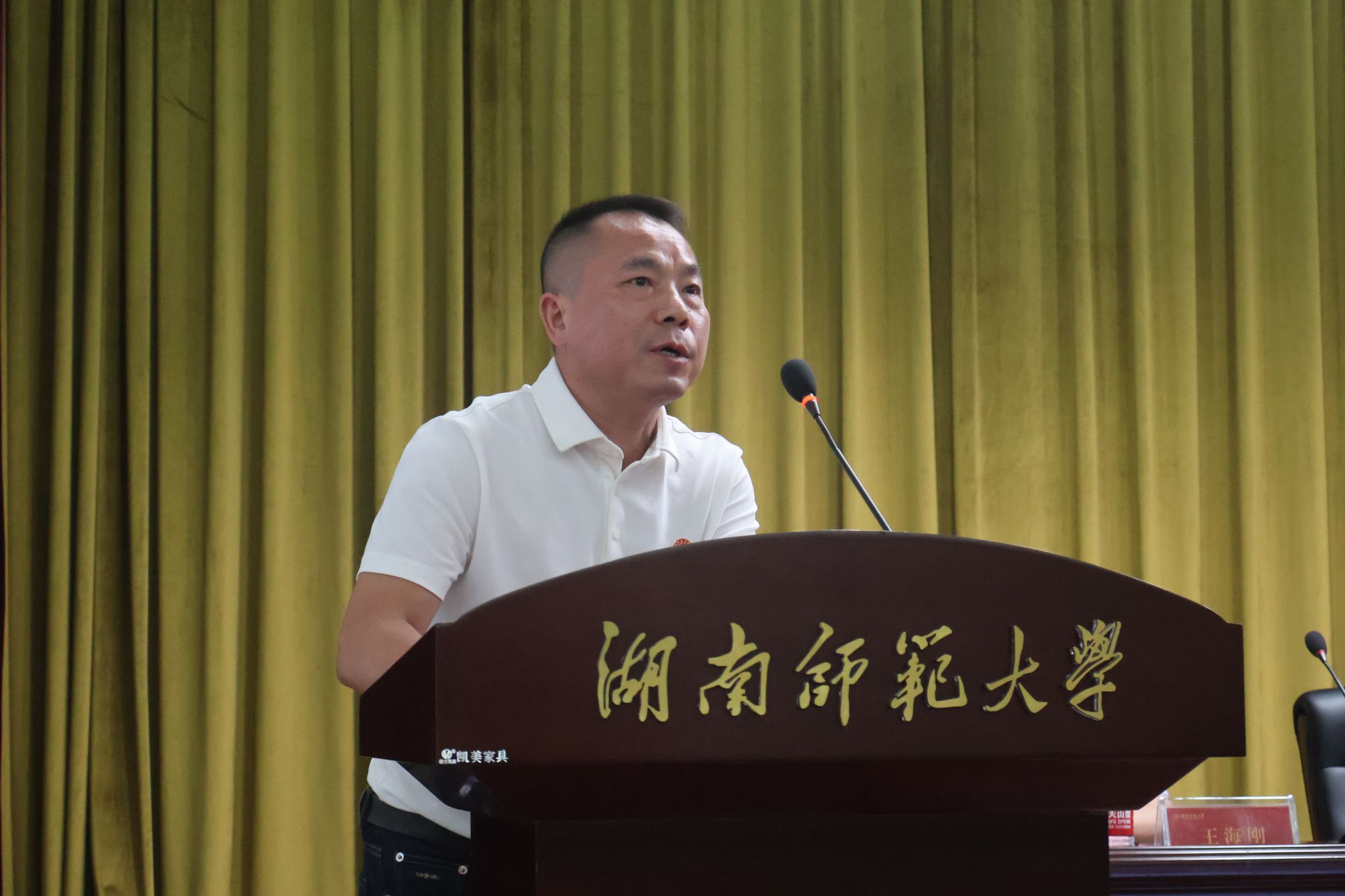 沈贤岚发表致辞,热烈祝贺并欢迎2023级本科新生加入湖南师范大学新闻与传播学院。他向新生们介绍了新传院在学校活动、学科建设、校友发展等方面取得的优秀成绩,并向新生提出了五点期望:一是要树立远大理想,将个人理想融入中华民族伟大复兴的时代征程中;二是要主动识变求变,构建能够适应时代变化的知识体系;三是要坚持内外兼修,积累人品和才华;四是要坚持学习,融会贯通专业知识;五是要强健体魄。最后,他预祝同学们大学生活收获满满,不负青春、不负韶华。