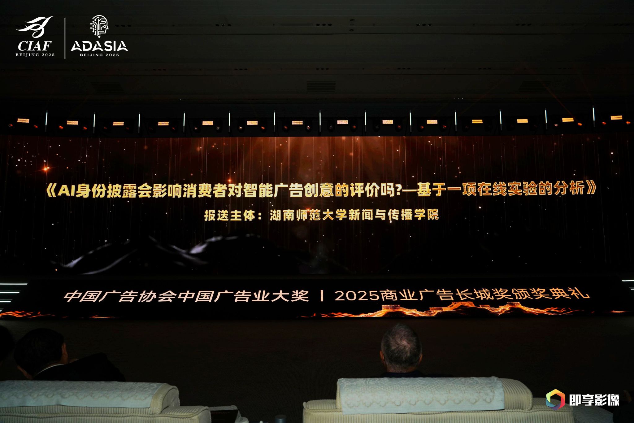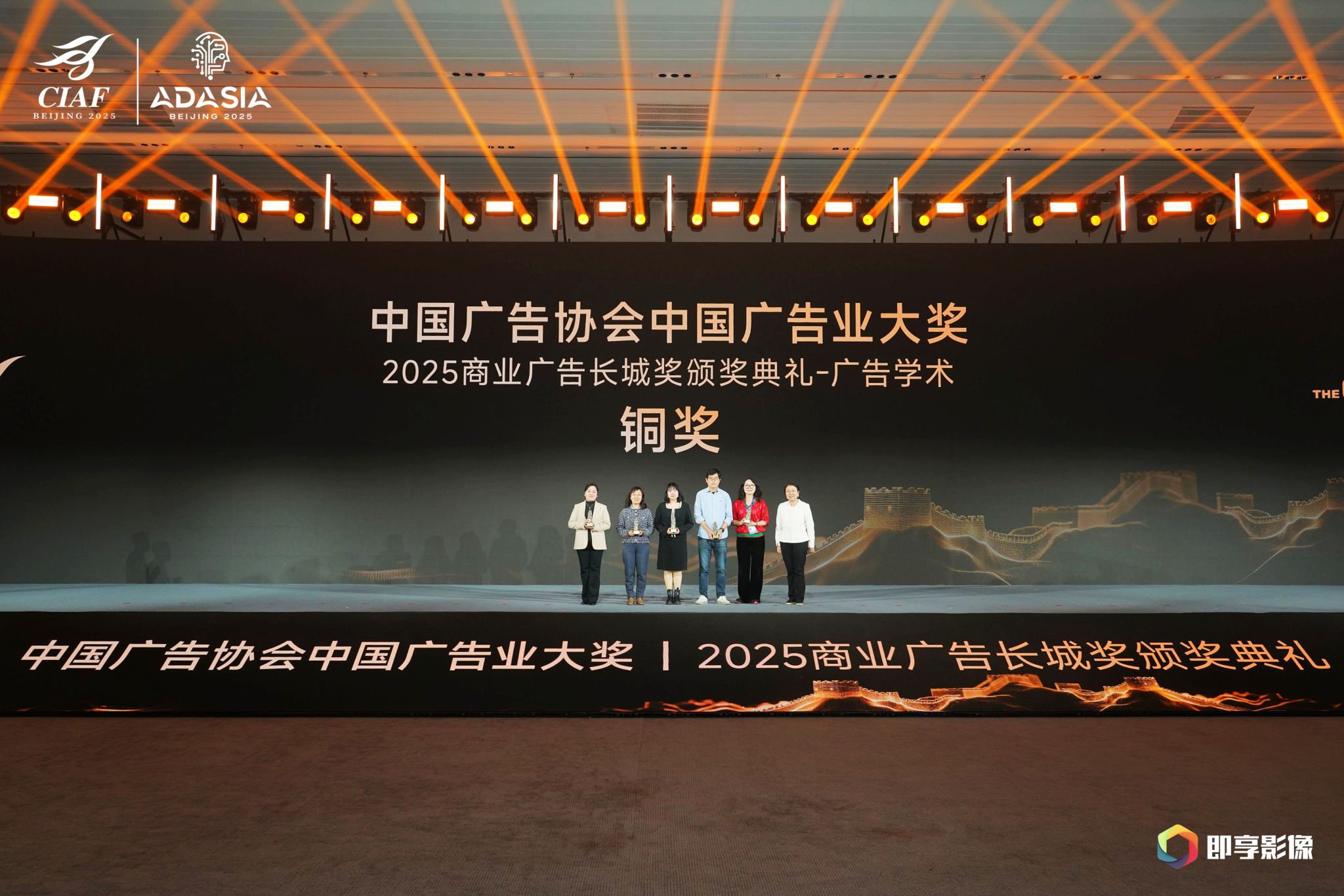 (通讯员 曾奕嘉 马源)2025年10月25日晚,中国广告业大奖·2025商业广告长城奖颁奖典礼在北京中关村国际创新中心畅春厅BC厅隆重举行。作为第32届中国国际广告节的核心活动之一,本届长城奖(广告学术类)等级奖名单现场揭晓,共产生五银五铜(金奖空缺),主办方为获奖者颁发了奖杯。湖南师范大学新闻与传播学院广告系主任曾琼教授及其2024级博士研究生马源发表于《新闻大学》2025年第5期的论文《AI身份披露会影响消费者对智能广告创意的评价吗?——基于一项在线实验的分析》荣获长城奖(广告学术类)铜奖。