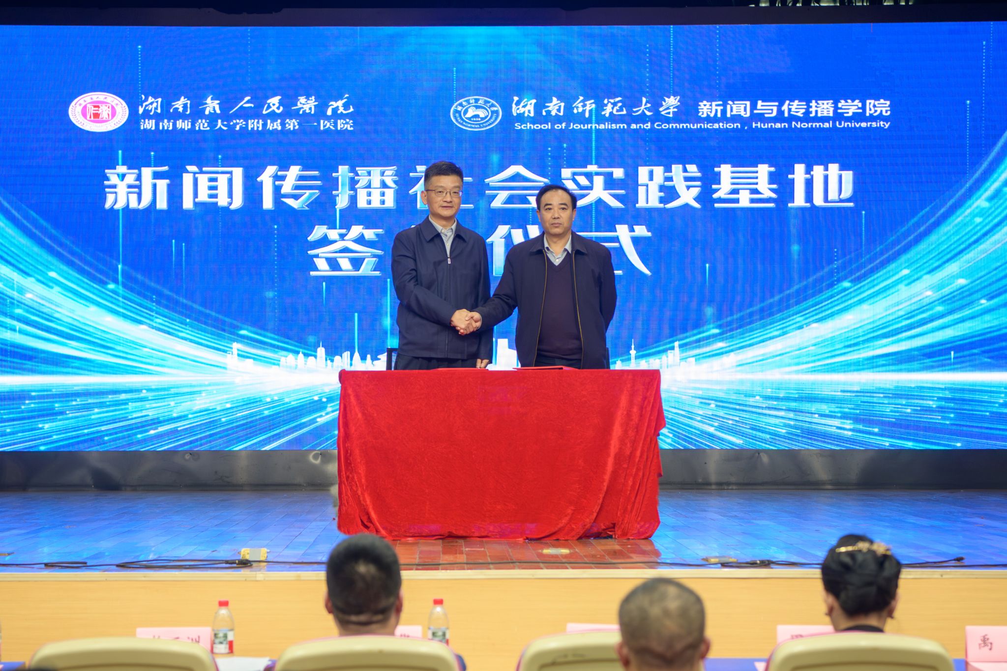 (通讯员 王倩)2025年10月30日,湖南师范大学新闻与传播学院与湖南省人民医院举行新闻传播社会实践基地签约挂牌仪式。这标志着双方在健康传播领域的深度合作正式启动。湖南省人民医院党委书记赵卫华、院长肖亚洲,湖南师范大学新闻与传播学院党委书记王胜章、副院长周伊慧,新闻系教授禹菲,网络与新媒体系副教授熊敏,部校共建办副主任王倩参加仪式。仪式由湖南省人民医院党委副书记朱丽琴主持。
