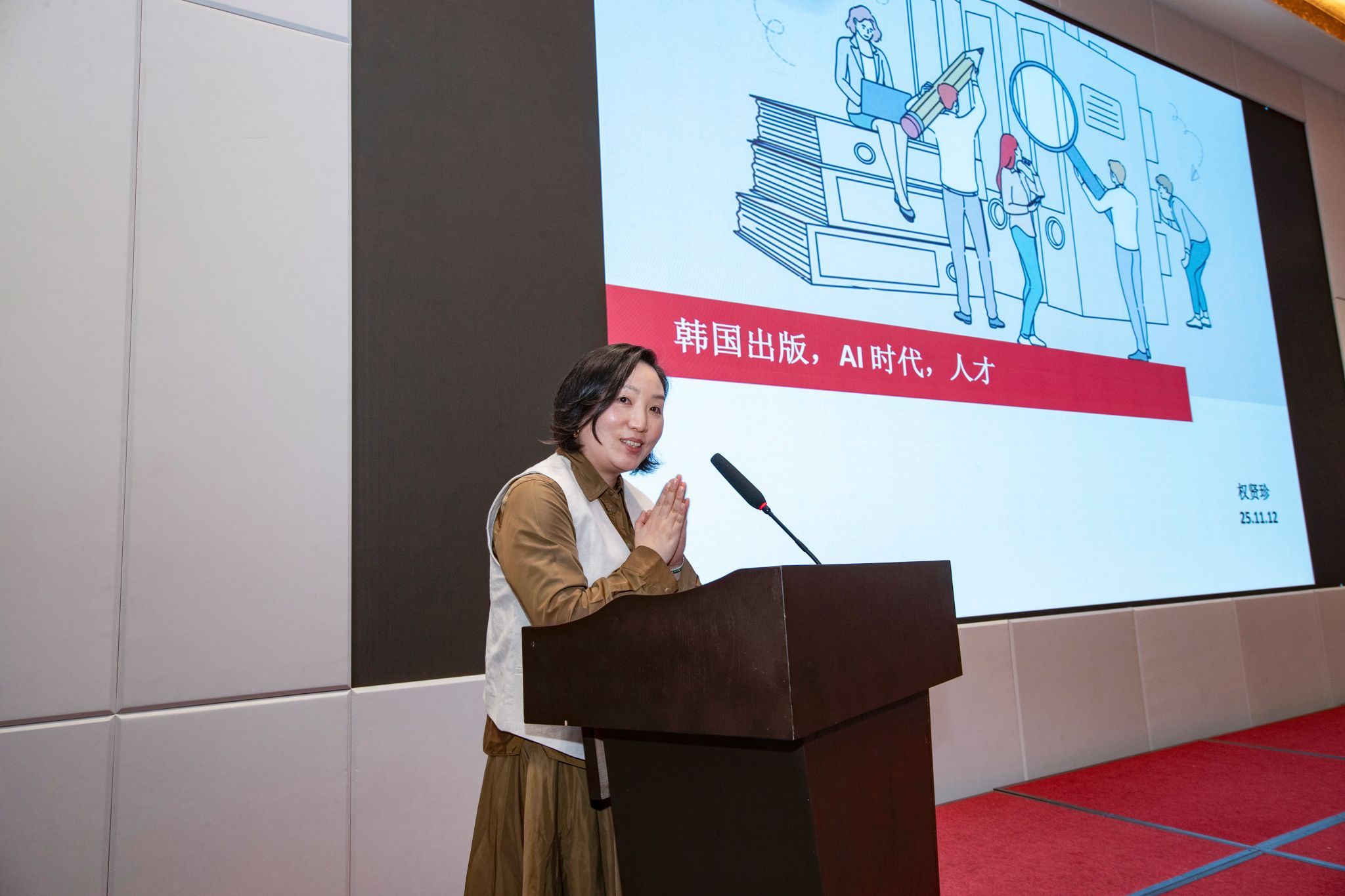 韩国文化体育观光部韩国文化产业振兴院北京代表处原首席研究员权贤珍(韩国)介绍了韩国出版市场现状,分享AI在封面设计、插图绘制、翻译排版等领域的应用案例,强调AI是辅助工具,最终还需人类对品质把关,需培养具有深厚人文素养的出版人才。