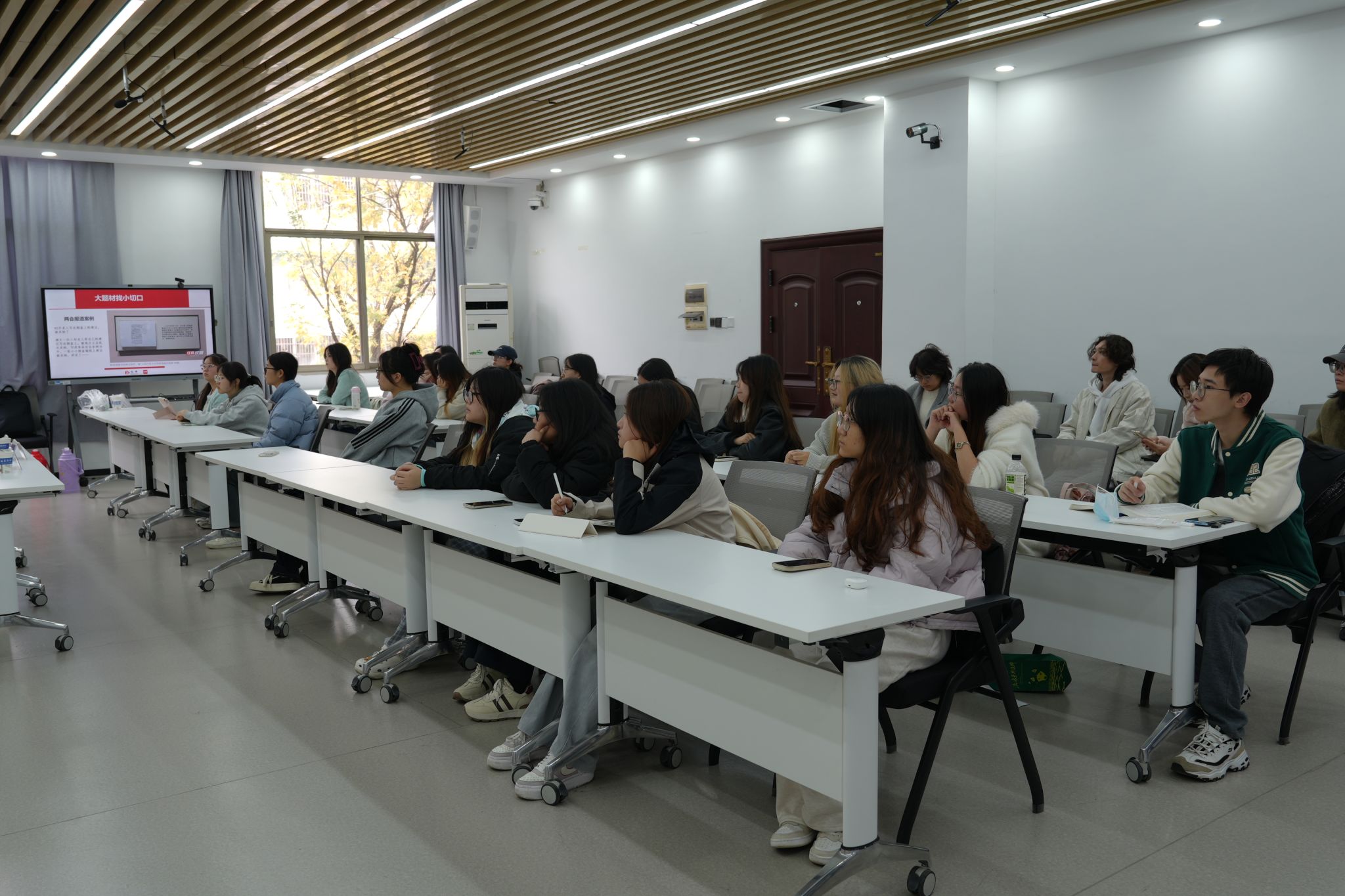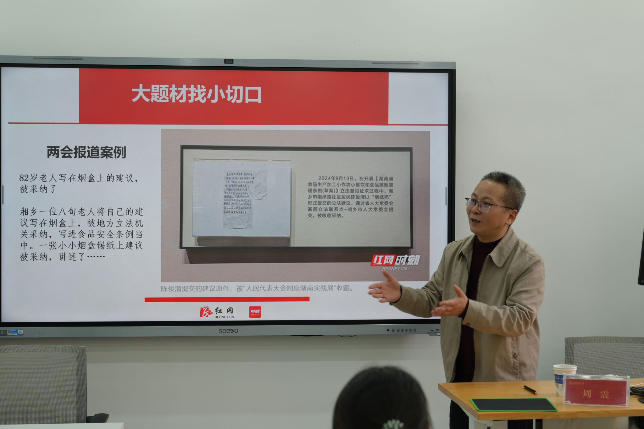 周震以“融媒时代的写作与编校”为核心主题展开分享,从写作素养与编校素养两个维度系统授课。在写作素养方面,他结合红网的典型新闻案例,强调新闻选题需与时代共情、与读者共情,要想题、想事、想词,从大题材找小切口,并且把小切口做大做强。同时提出写作应兼顾年轻化表达与传播创新性,贴合青年群体认知习惯,融合多元传播形式,增强内容感染力;编校素养方面,周震表示应坚持零差错标准,严守底线,保证稿件的政治导向正确,要深刻认识到互联网传播的变量特性,避免“低级红高级黑”等错误倾向。
