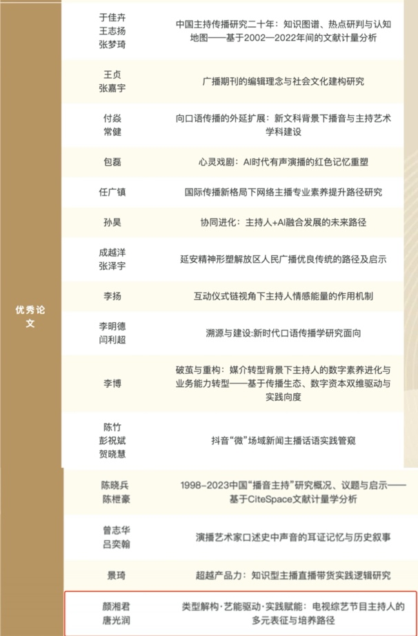 (通讯员 王宇)12月23日晚,第三届中国播音主持“金声奖”颁奖典礼在湖南长沙举行。同期举办的首届“金声奖”播音主持论文论著推选活动结果揭晓,我校新闻与传播学院教师研究成果表现突出。其中,陈淼副教授等人撰写的论文《从专业权威到用户共创:人工智能时代体育解说的话语权力变迁研究》获评“最佳论文”;颜湘君教授等人撰写的《类型解构·艺能驱动·实践赋能:电视综艺节目主持人的多元表征与培养路径》一文入选“优秀论文”。