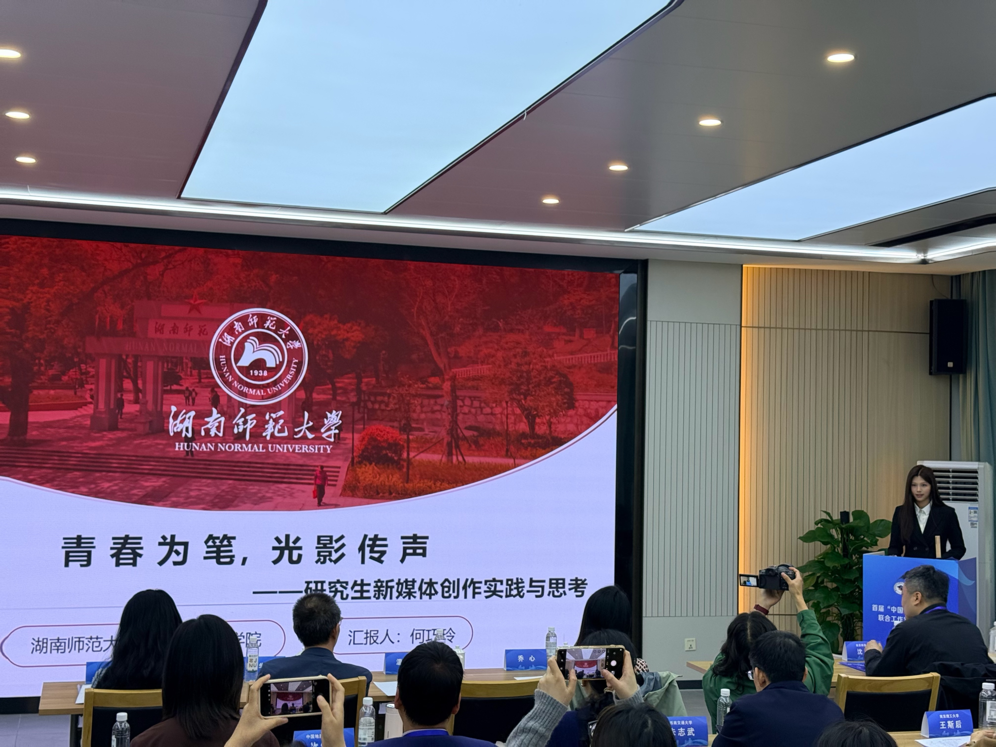 主旨论坛中,何巧玲作为学生代表结合团队创作的两部原创爆款作品,分享了研究生新媒体创作从起步到探索传播路径的实践历程,展示作品及相关分享引发与会师生关注。专题座谈中,张磊简介了我校“项目融入课程”的创新做法,并针对“传播效果与数据分析”“运营痛点与方案优化”做案例分享。