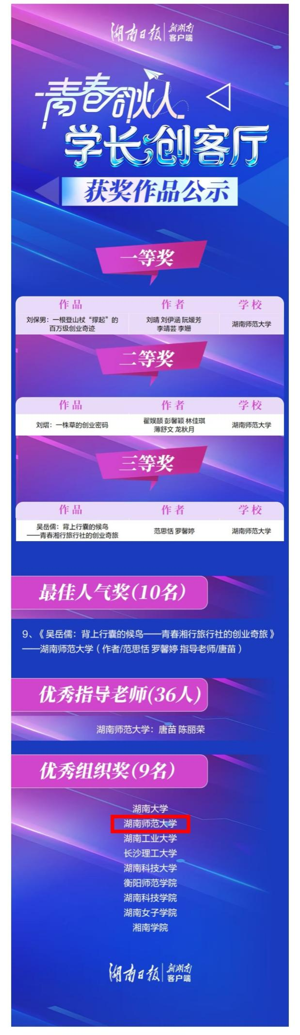 (通讯员 刘伊涵)4月25日下午,由湖南日报社发起、联动全省26所高校的“青春合伙人·学长创客厅”UGC主题征集活动成果展示暨颁奖仪式在长沙理工大学云塘校区图书馆报告厅举行。我院师生在此次活动中表现优异,斩获多个奖项。2023级网络与新媒体专业刘晴同学小组斩获一等奖第一名,翟娱颉同学小组获二等奖,新闻学专业范思恬同学小组同时摘得三等奖与最佳人气奖。我院实现了全奖项覆盖,获奖比例位居所有参赛学校之首,也因此获评优秀组织单位奖,唐苗老师获优秀指导教师奖。