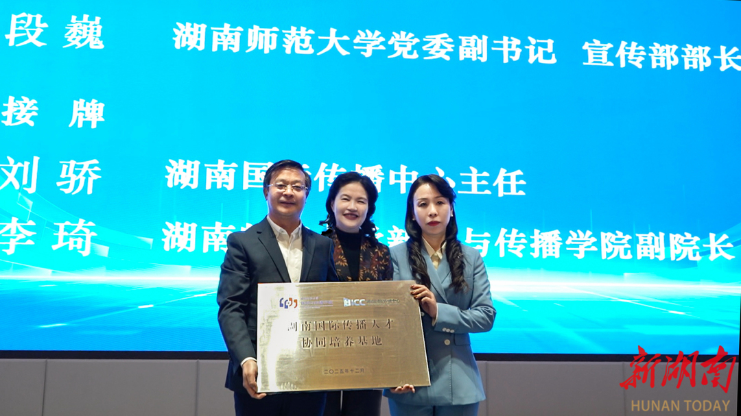在论坛开幕环节,中国工程院院士、湖南师范大学校长刘仲华通过视频方式发表致辞。中共湖南省委宣传部副部长、省广播电视局局长贺辉现场致辞,对本次论坛的召开表示祝贺,并就新时代国际传播能力建设与创新发展提出展望。开幕式上,湖南师范大学党委副书记、宣传部部长段巍为“湖南国际传播人才协同培养基地”授牌,标志着湖南在推动政产学研协同、构建国际传播育人体系方面取得重要进展。