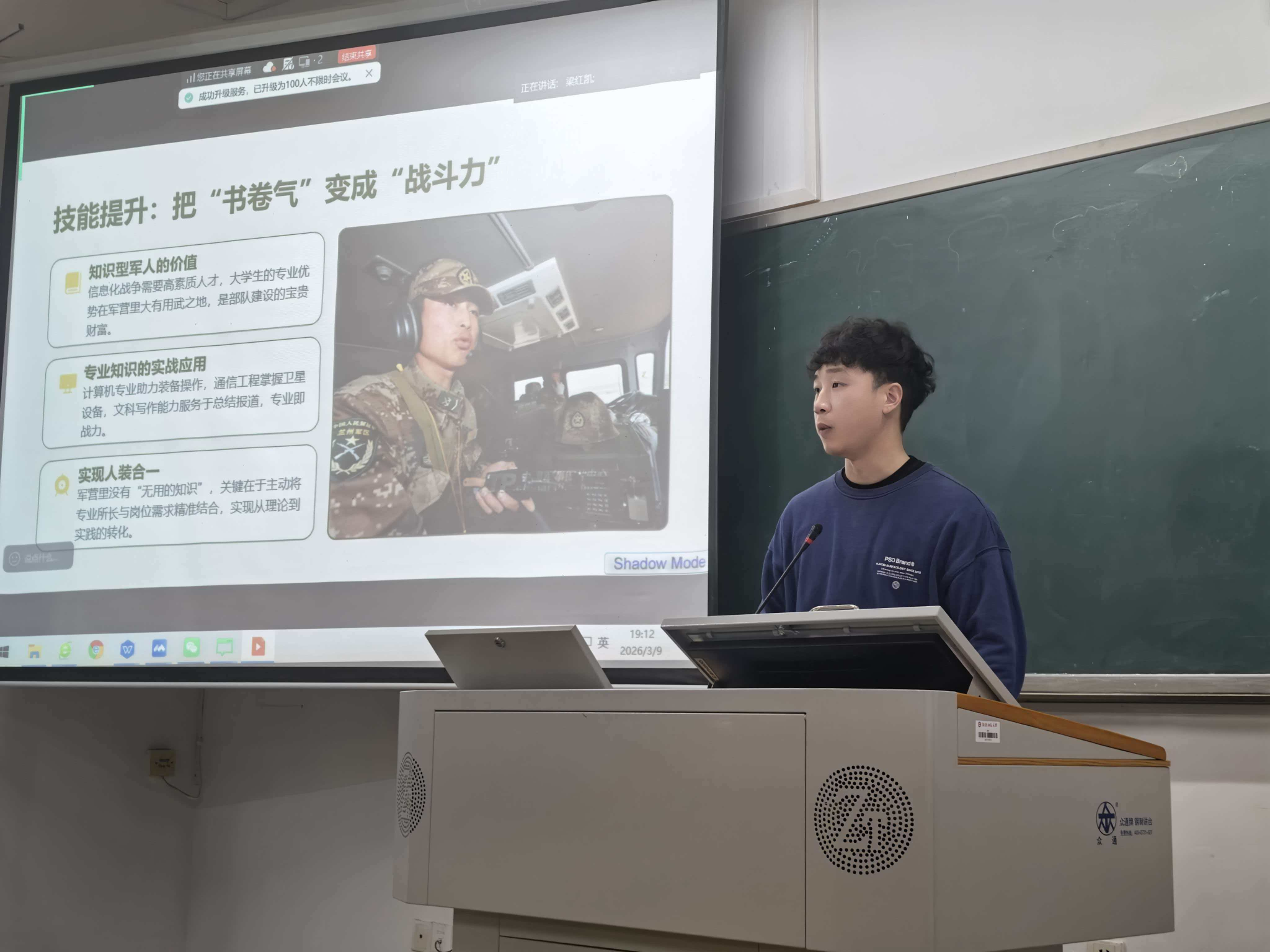 分享环节中,梁红凯结合个人服役经历,介绍军旅生活日常与服役期间的收获与荣誉。他围绕大学生参军入伍报名流程、注意事项、政策优势等内容进行讲解,为有参军意向的学生提供参考与解答。梁红凯表示,参军入伍是一份荣誉与责任,也是一段具有重要意义的成长经历。部队生活能够磨砺意志、塑造品格,帮助青年提升自我、锤炼心性。他结合自身成长经历,鼓励同学们把握青春,积极投身军营,以实际行动践行报国初心。