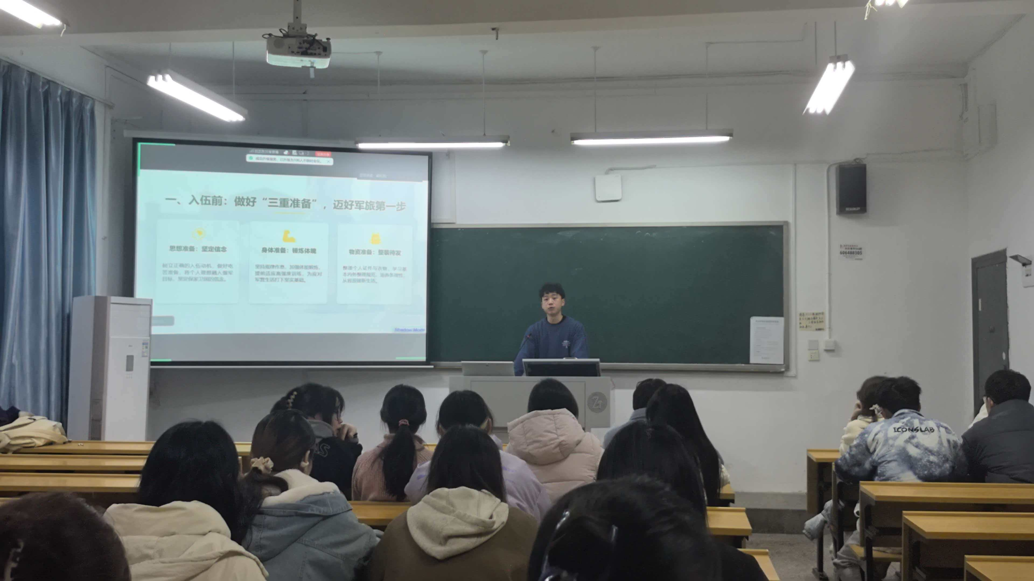 (通讯员 欧阳礼谦)3月9日,新闻与传播学院“士兵突击2:大学生参军入伍经验分享”精勤讲堂在线下会场与腾讯会议线上同步举行。此次活动特邀学院23级播音与主持艺术专业学生梁红凯作为主讲人,旨在为有意向参军入伍的同学提供第一手经验参考。