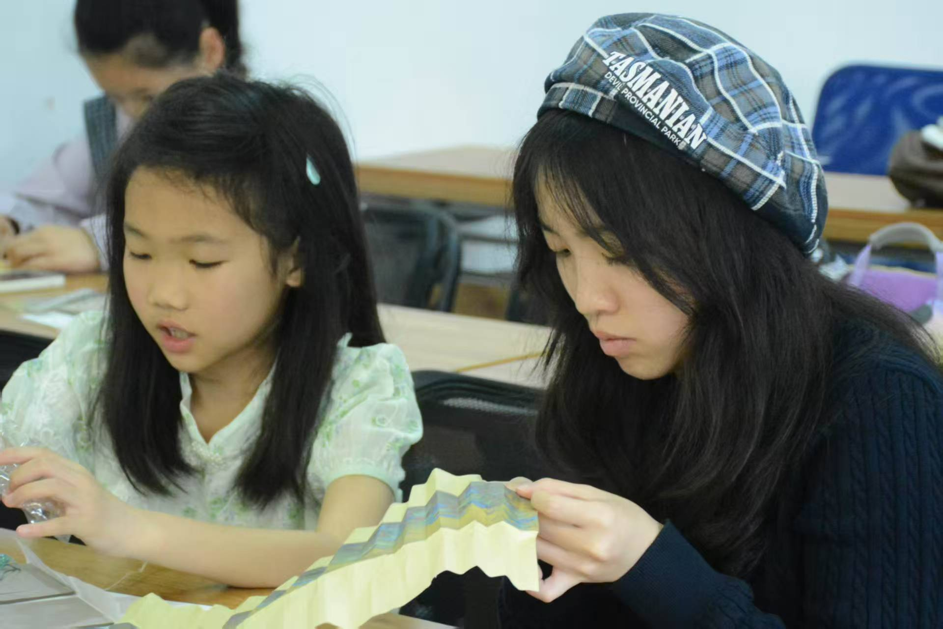 理论科普结束后,志愿者为孩子们分发扇形灯架、彩纸、流苏、胶棒等材料,示范制作步骤,手把手进行指导,并针对孩子们在裁剪、粘贴中遇到的问题及时帮忙调整。在志愿者的协助下,一个个图案各异、寓意美好的清明主题扇形灯逐渐成型,孩子们体验到了手工创作的乐趣,理解了清明节“慎终追远、缅怀先人”的文化内涵,也在动手过程中感受到了传统手工艺的独特魅力。